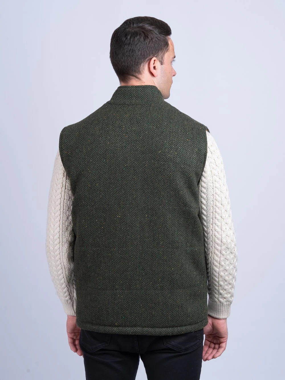 Notre veste sans manches Sullivan a été conçu pour allier style et confort. Elle est fabriquée à la main par des tailleurs à Balbriggan, dans le comté de Dublin. Cette veste en tweed présente un design matelassé pour vous garder au chaud tout en restant élégant. Elle est ornée de détails en cuir nappa au niveau du col et des poches. Idéale à porter par-dessus un pull en maille épaisse ou une chemise, cette belle pièce de design irlandais vous accompagne au quotidien avec élégance.